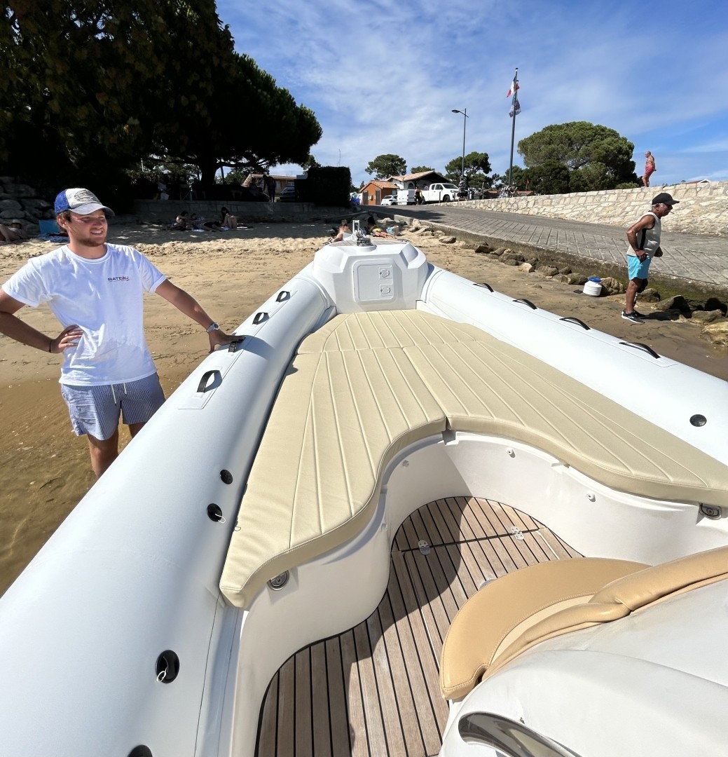 Superb 9 meter hull in very good condition, excellent seakeeping, very comfortable. The boat is equipped with two new 150hp high thrust engines from 2024. Its 300hp will allow you to do all types of water sports, it is fast and thanks to its two engines, very easy to maneuver. 4-stroke direct injection engines, very reasonable consumption. - Offshore safety equipment, ideal for fishing, walking, and can accommodate up to 20 people on board. - Large sunbathing area front and rear - Sun awning, - Complete teak deck - Anchor lifting windlass, electric - GPS - Central cabin Very easy to handle whatever the level and experience of the captain! Very flexible hours, Do not hesitate to contact me for any questions. Pierre
