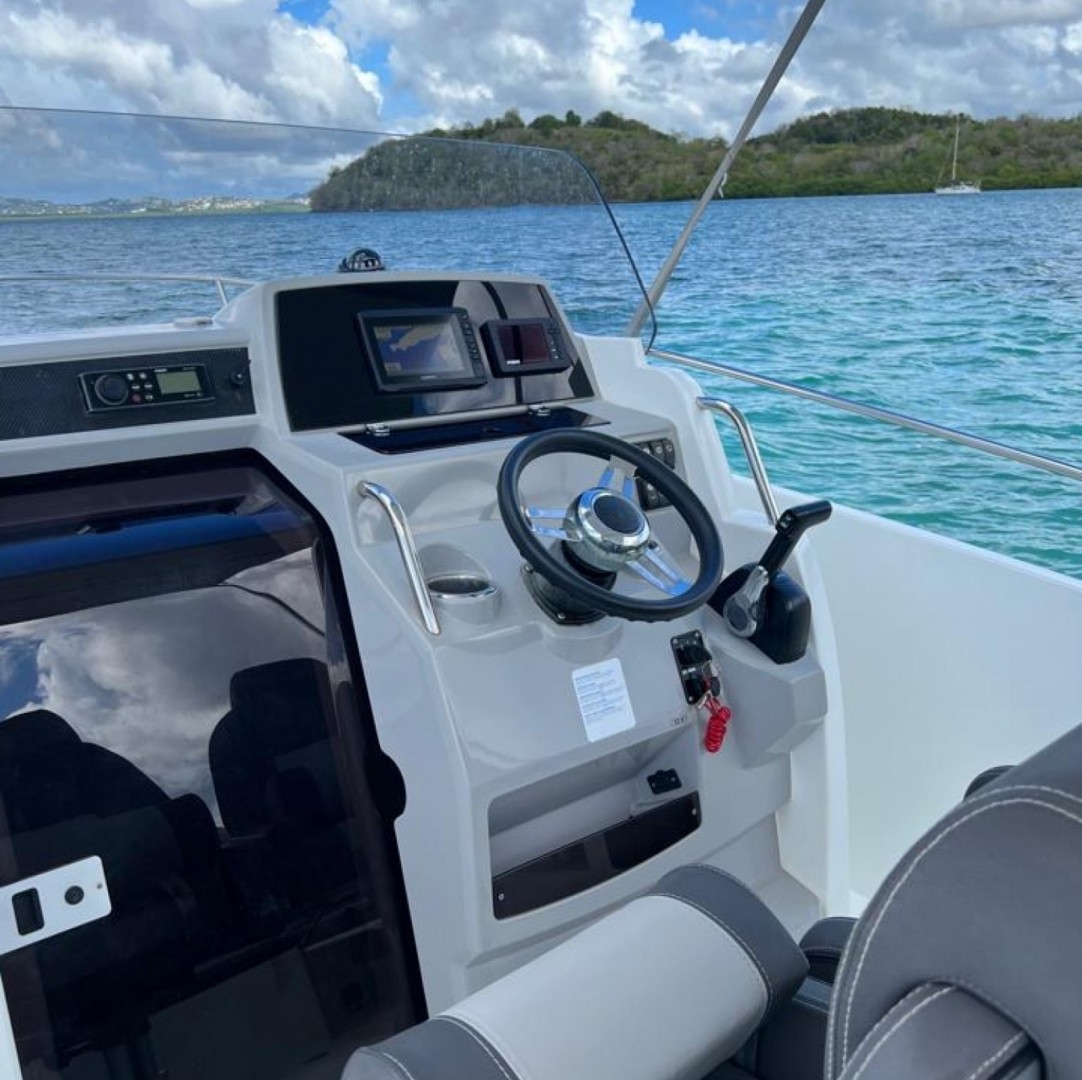 Welcome aboard this magnificent Jeanneau Cap Camarat 7.5 CC Series 2. It is the ideal boat for a day trip to discover the Caribbean coast (Arlet cove for turtles, Diamond Rock, Carbet for dolphins, etc.) It can accommodate up to 10 people in total. We offer several options (towable buoy, paddle, wakeboard, kneeboard, and our flagship product the Underwater Thruster). For more information, do not hesitate to contact me I will be delighted to assist you in your navigation project. See you soon, Michael