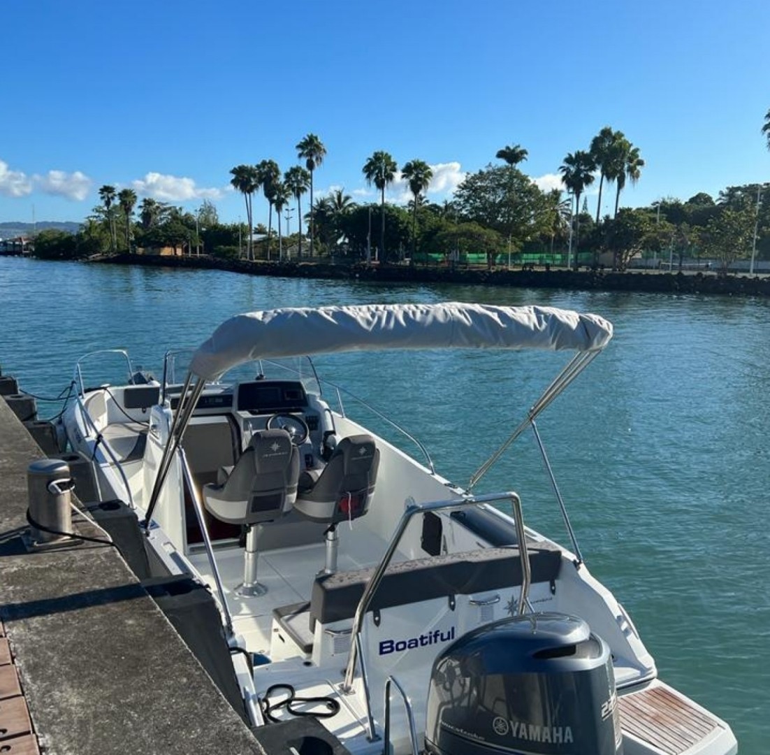 Welcome aboard this magnificent Jeanneau Cap Camarat 7.5 CC Series 2. It is the ideal boat for a day trip to discover the Caribbean coast (Arlet cove for turtles, Diamond Rock, Carbet for dolphins, etc.) It can accommodate up to 10 people in total. We offer several options (towable buoy, paddle, wakeboard, kneeboard, and our flagship product the Underwater Thruster). For more information, do not hesitate to contact me I will be delighted to assist
