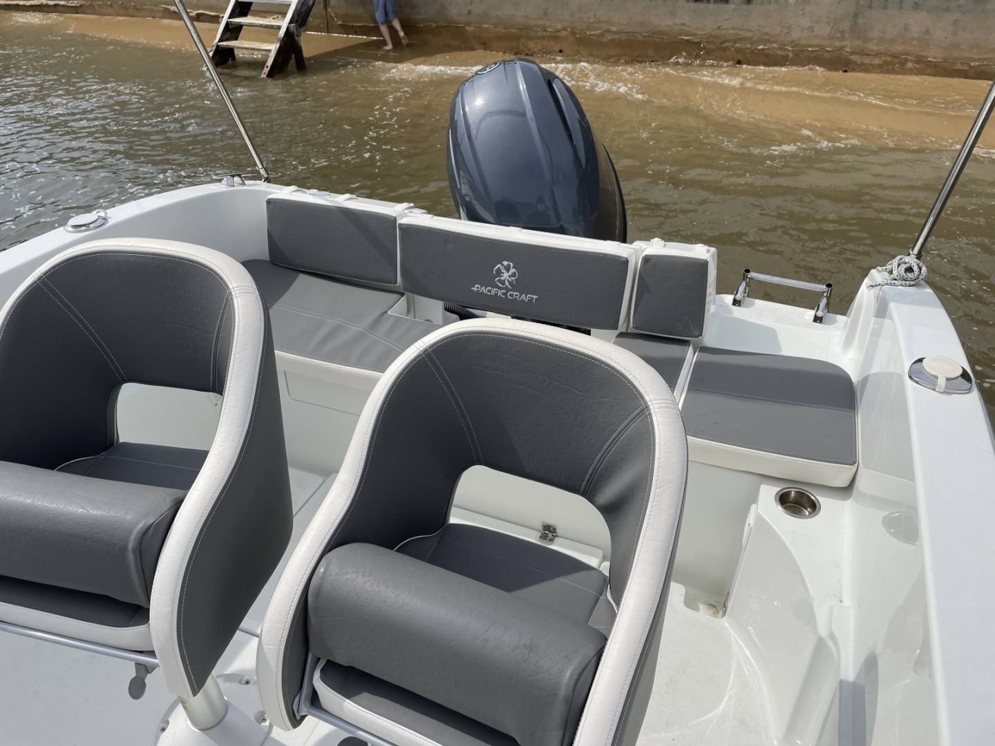 Magnífica embarcación para 6 personas, su casco marcado en V y proa tulipada se asocian a francobordos altísimos lo que genera la navegación más flexible al abrigo de las salpicaduras del mar. El espacio en cubierta es ideal, con una gran consola, numerosos cofres, un gran casillero de ancla y accesorios de calidad. Numerosos equipamientos: - Mesa de comedor con asiento cuadrado - Toldo bimini - Sonda GPS - Molinete eléctrico - Tumbona grande Motor de 100 caballos, muy silencioso y de bajo consumo. Sal a explorar Banc d' ¡Arguin y Bird Island a bordo de este magnífico barco abierto familiar! Disponible desde el embarcadero de Grand-Piquey, en Lège Cap-ferret
