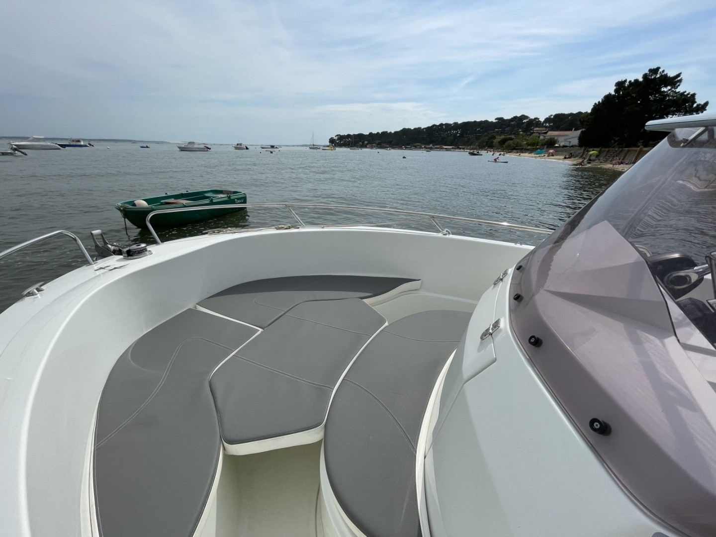 Magnífica embarcación para 6 personas, su casco marcado en V y proa tulipada se asocian a francobordos altísimos lo que genera la navegación más flexible al abrigo de las salpicaduras del mar. El espacio en cubierta es ideal, con una gran consola, numerosos cofres, un gran casillero de ancla y accesorios de calidad. Numerosos equipamientos: - Mesa de comedor con asiento cuadrado - Toldo bimini - Sonda GPS - Molinete eléctrico - Tumbona grande