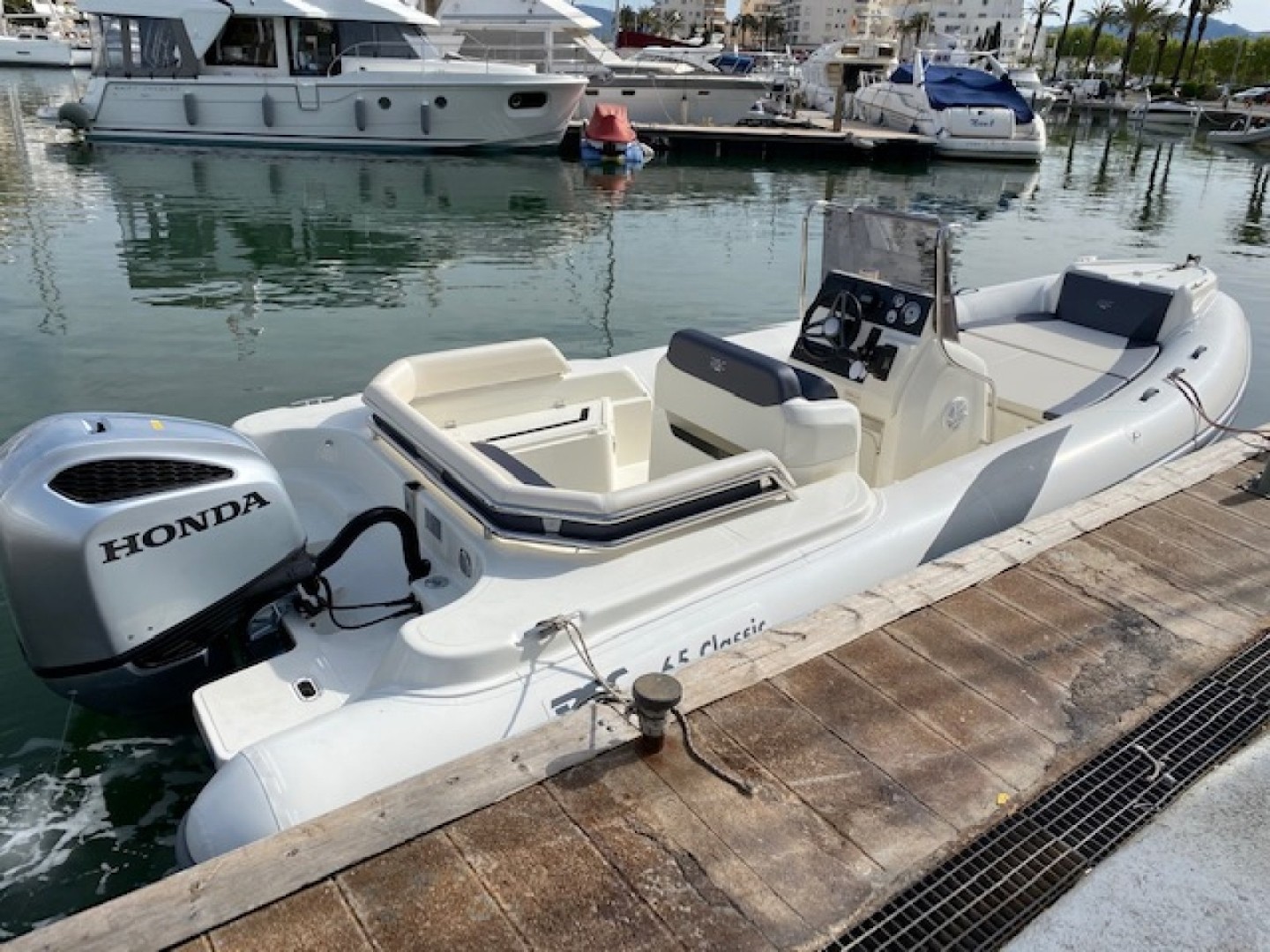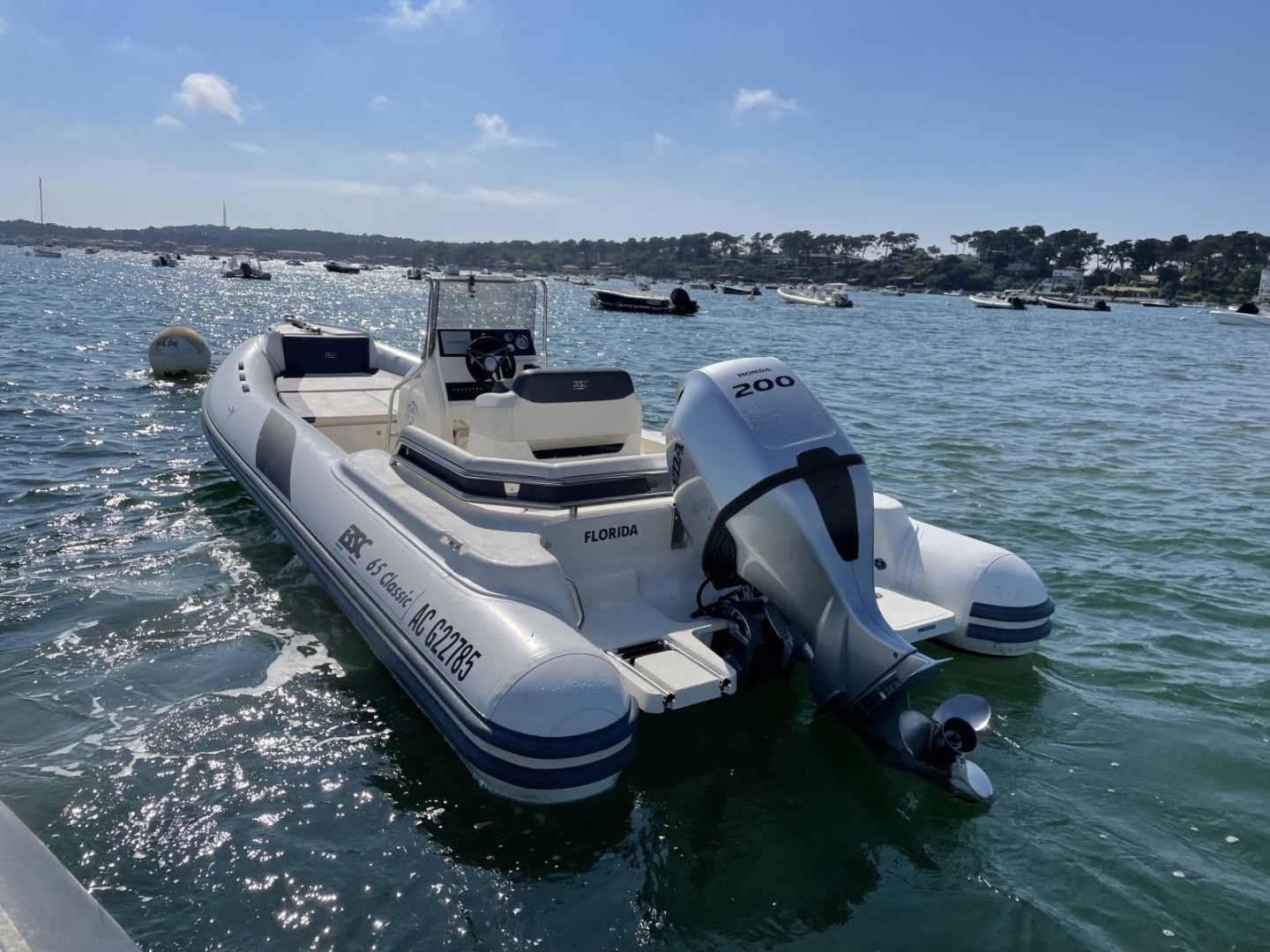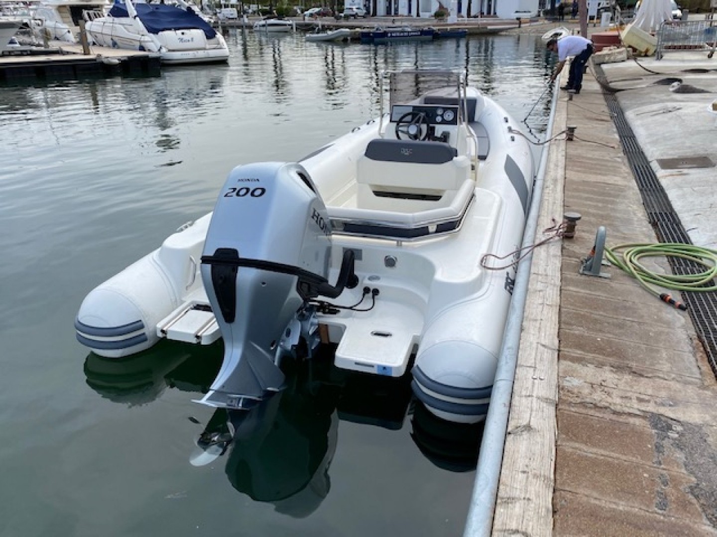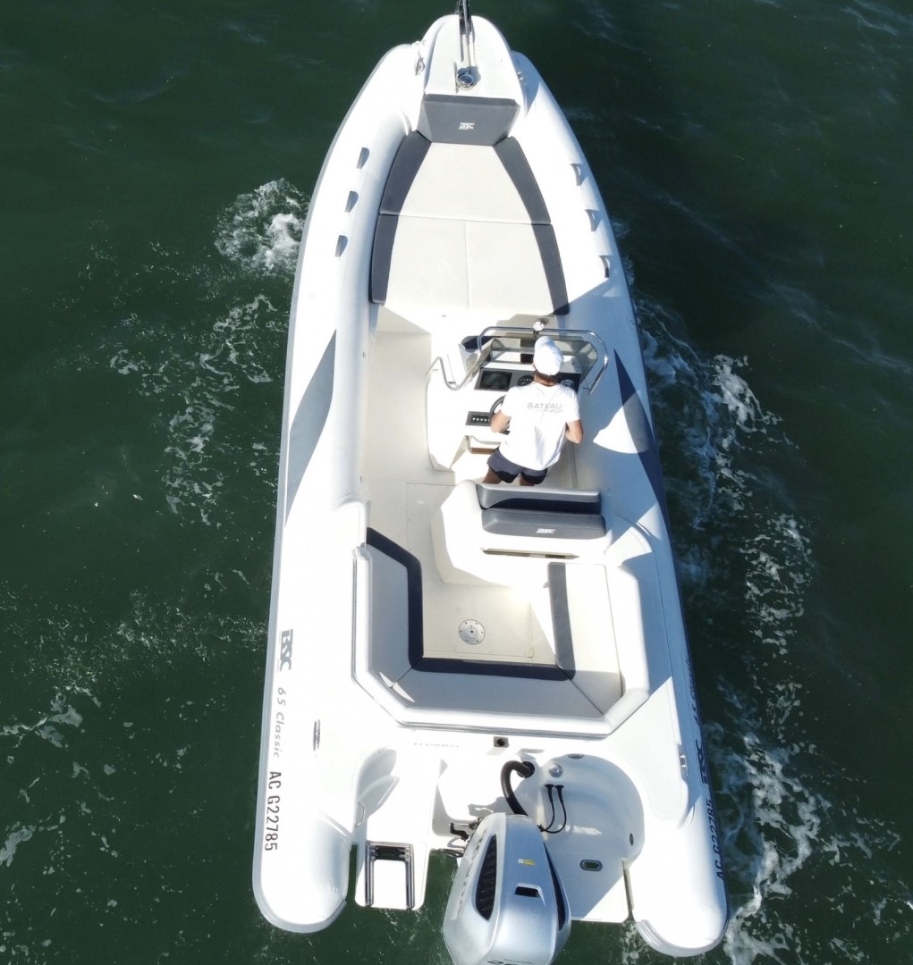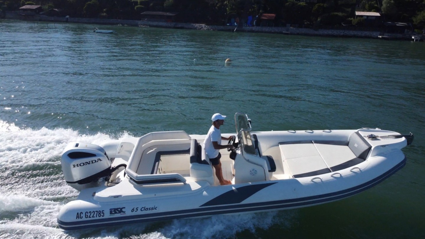 Semirígida italiana, muy buena calidad, marca BSC, nueva. Está equipado con un motor de 150 caballos (inyección Honda de 4 tiempos), potente, muy silencioso, limpio y de muy bajo consumo. Situado en el punto de amarre a 20 metros del muelle de Grand-Piquey (posibilidad de encontrarse en otro lugar). - Tiene una gran tumbona delantera, - Zona de estar con mesa de comedor en la parte trasera, también convertible en tumbona. - Radio Hi-Fi Bluetooth