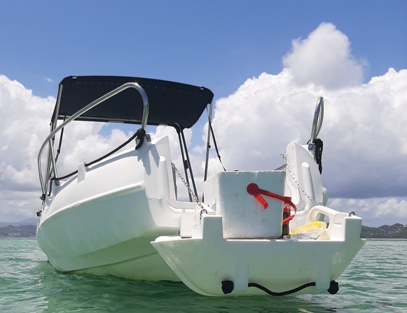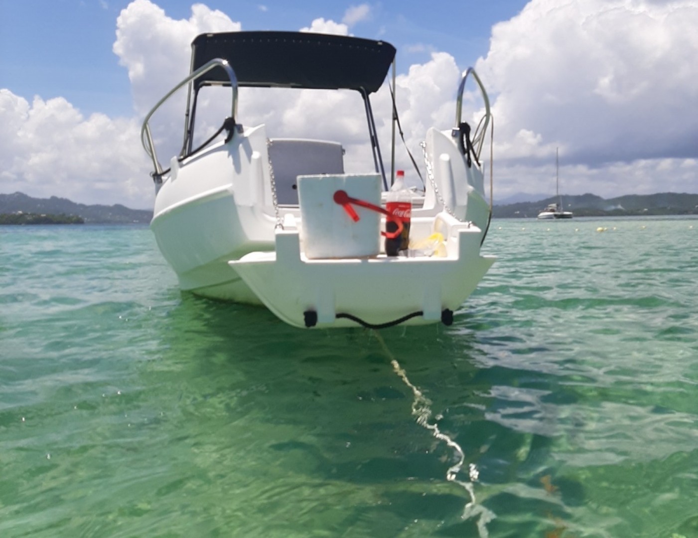 Esta embarcación está homologada para 10 personas en categoría D, y 8 en categoría C, pero la comodidad de uso es de 5 o 6 personas. Está equipado con una Suzuki de 70 HP, un pequeño toldo para protegerte del sol y un GPS. El arco frontal se abre y te permitirá instalar una barra accesible en los fondos blancos para recuerdos inolvidables. El barco está equipado con GPS y las rutas prediseñadas le permitirán llegar con seguridad a los islotes Robert y François y descubrir lugares mágicos como la bañera de Joséphine, el islote Madame, etc.... en caso de cancelación debido al mal tiempo (aviso amarillo o viento de fuerza 6 o 7 por ejemplo), el alquiler será reembolsado íntegramente. tendrás que repostar a tu regreso, pero podemos hacerte un paquete de gasolina de 40€. El depósito es de 2500€.
