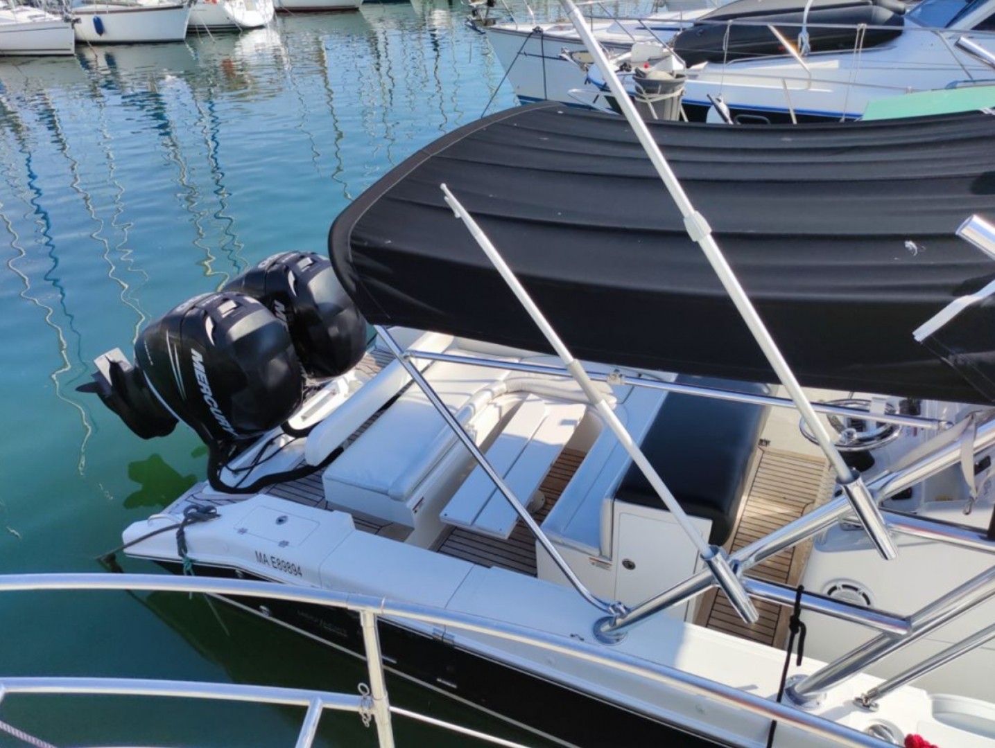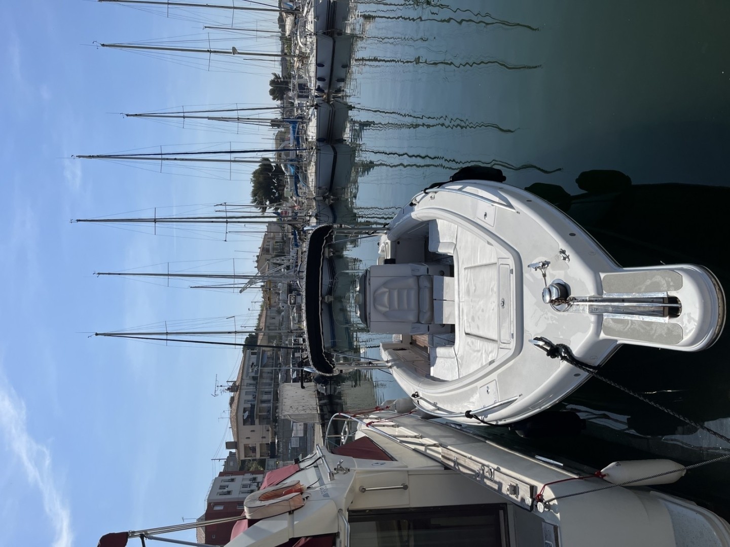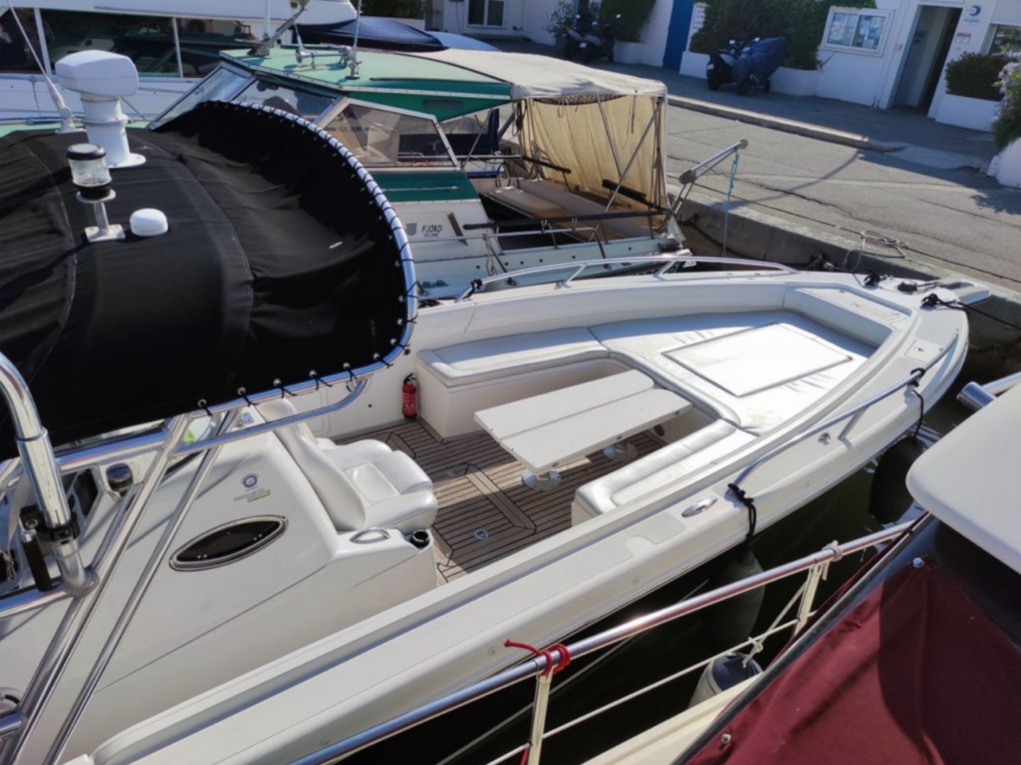 El precio del alquiler de la embarcación open Craft 360 AL DHAEN no incluye combustible ni el patrón obligatorio. Debes pagar la provisión del patrón al abandonar el barco: 300€, luego al finalizar tu viaje deberás reponer tu depósito de combustible. Calcula entre 150 y 350 € de combustible para un gran día en el mar. ¡Esta Al Dhean Craft - 360 Open mide 11 metros de largo! Es atípico por su línea y sus actuaciones offshore. Representa más que nunca la versatilidad característica de lo abierto. Su plano de cubierta es muy agradable y amigable. Nos encanta su nivel de acabado. En la parte delantera, encuentra una tumbona que se puede transformar en mesa. Alrededor de esta mesa pueden sentarse 4 o 5 personas. En la popa, un gran salón en forma de U también se puede convertir en tumbona. El barco está equipado con elementos de confort, WC eléctrico, ducha de agua dulce en cubierta, música, apertura lateral para facilitar el acceso al baño. Todo nuestro equipo está a su disposición para resolver sus dudas.