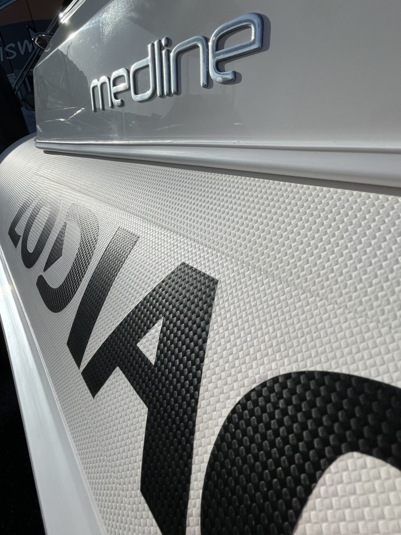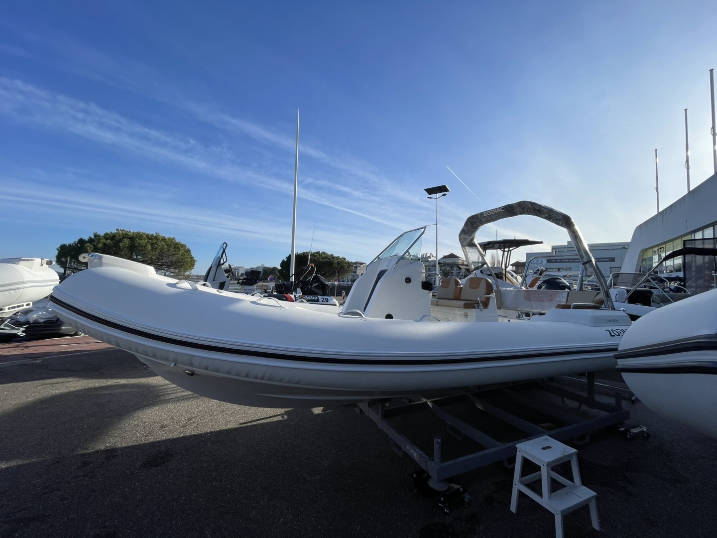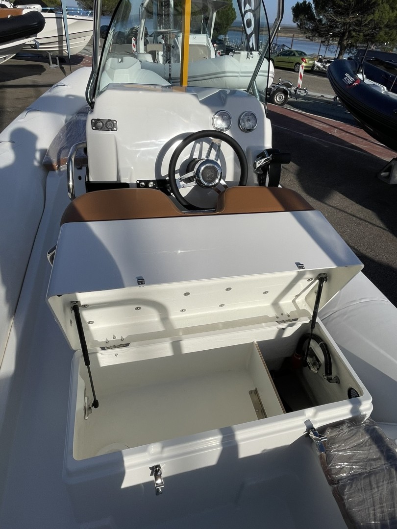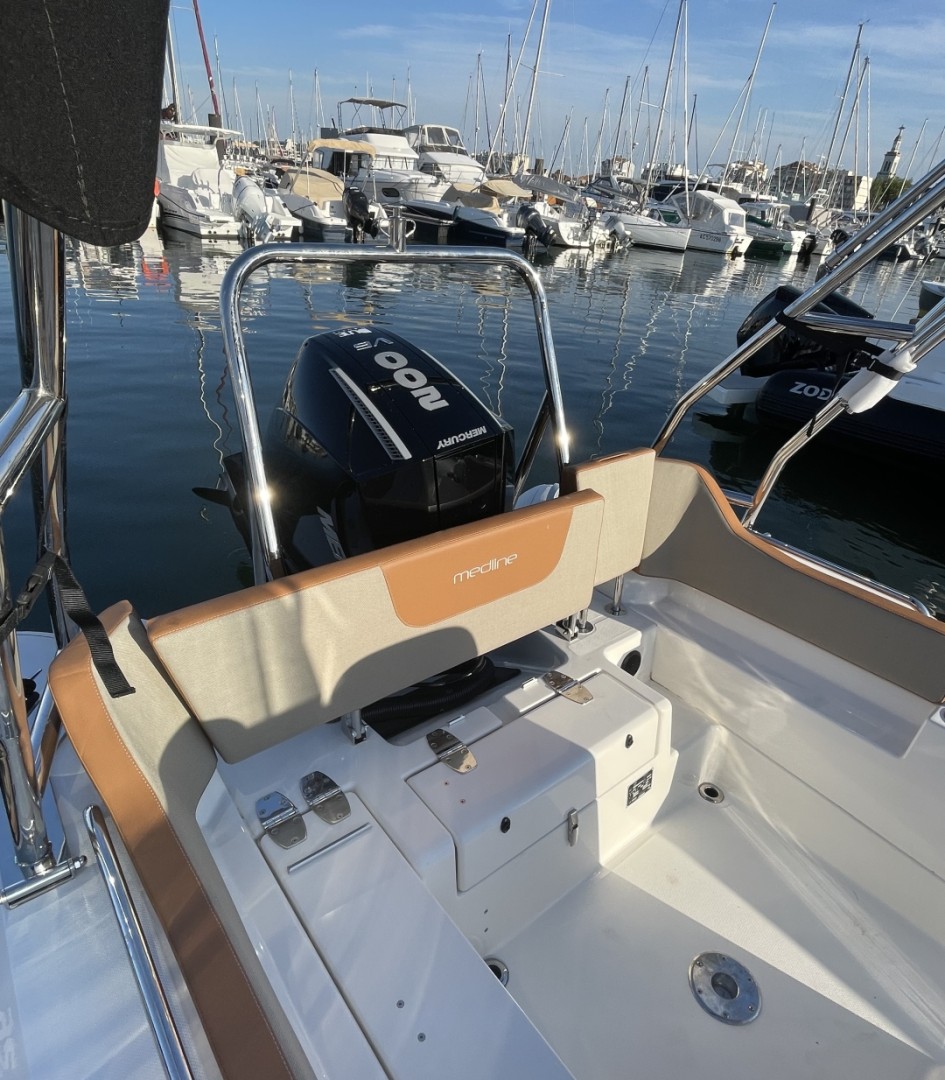 Le bateau est équipé, d'un grand bain de soleil avant, d'une confortable banquette arrière qui se transforme en bain de soleil, de grands coffres de rangements, d'un taud de soleil, d'un grand sondeur/GPS tacile 9 pouces Garmin, d'enceintes, de deux portes cannes et d'un chargeur USB.