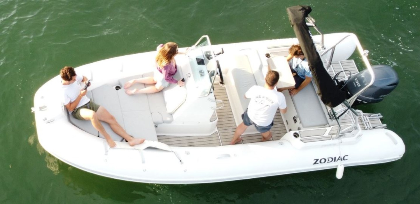 Le bateau est équipé, d'un grand bain de soleil avant, d'une confortable banquette arrière qui se transforme en bain de soleil, de grands coffres de rangements, d'un taud de soleil et d'un chargeur USB.