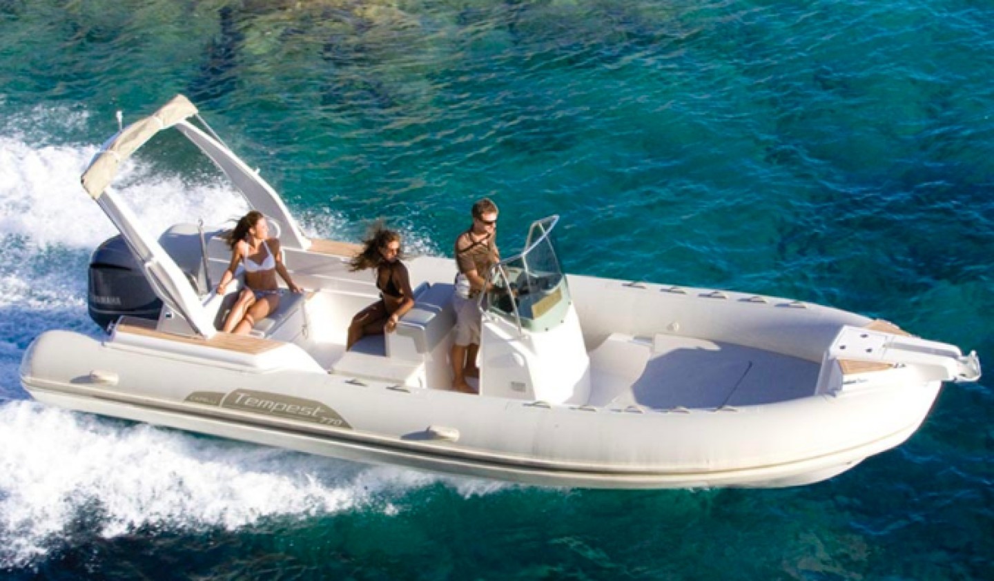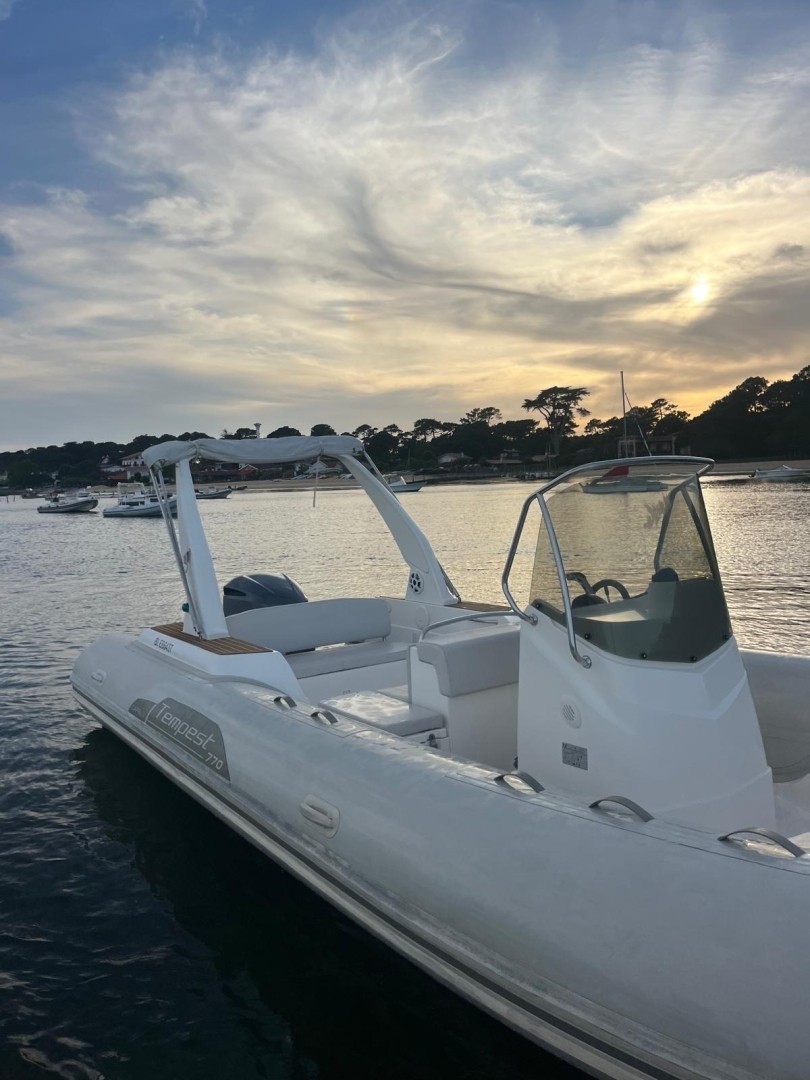 Capelli Tempest 770 – 250 cv Yamaha | Partenza: Grand Piquey / Cap Ferret | Noleggio giornaliero | O al tramonto per godere di un magnifico tramonto sul Bacino |⸻| | Barca potente, spaziosa e confortevole - Accoglie fino a 16 persone: | • Motore Yamaha 250 cv - navigazione fluida, stabile e piacevole | • Ampi prendisole a prua e a poppa con prolunghe | • Bimini per pranzare o riposarsi all'ombra | • Tavolo rimovibile per condividere un