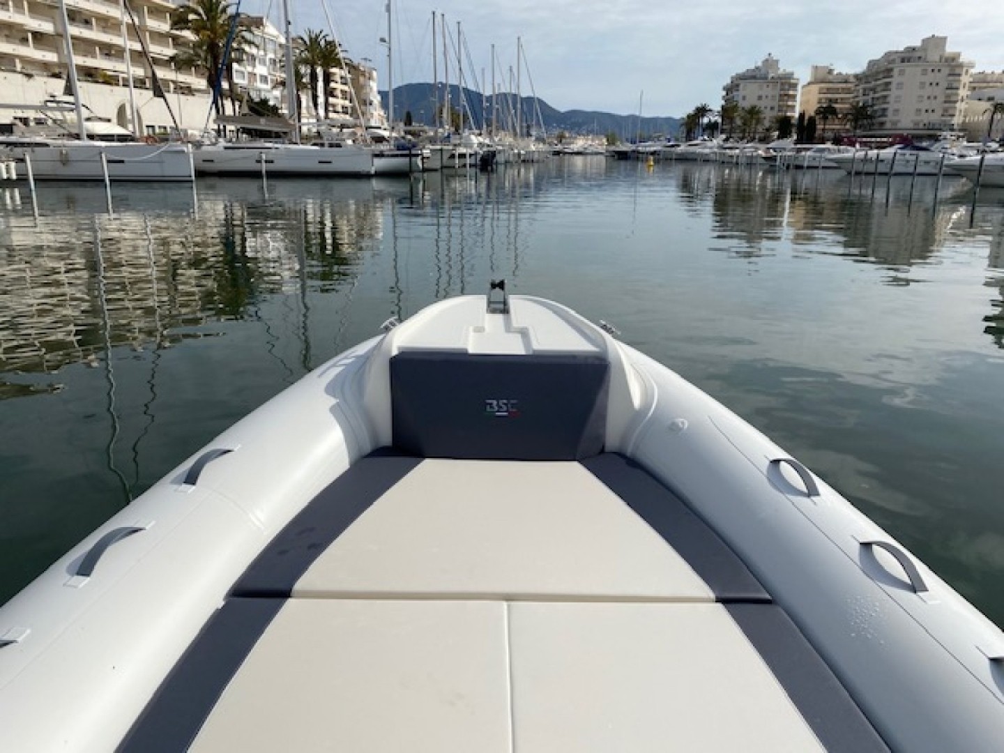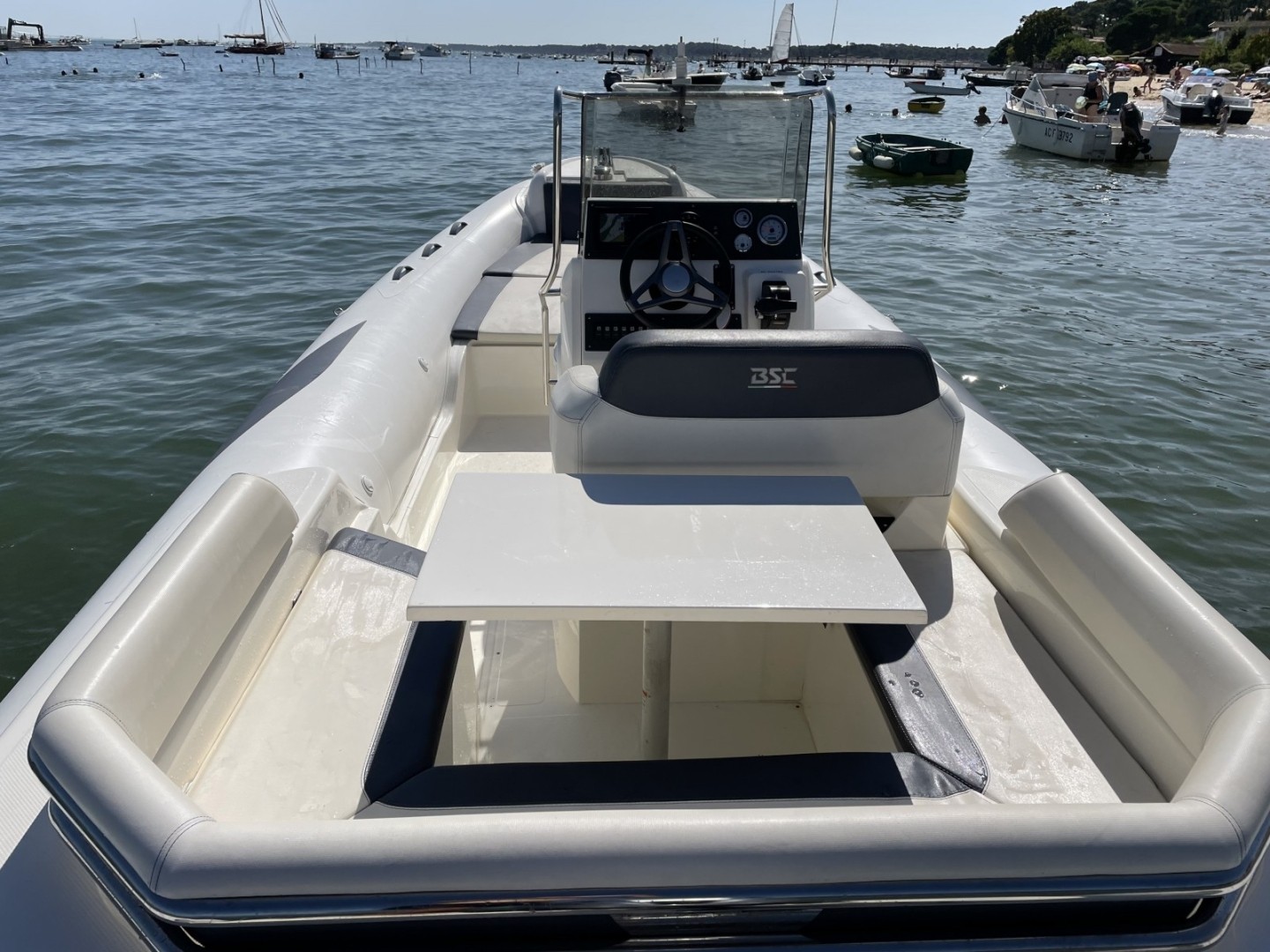 Semirigido italiano, ottima qualità, marca BSC, nuovo. È dotato di un motore da 150 cavalli (iniezione Honda 4 tempi), potente, molto silenzioso, pulito e molto efficiente nei consumi. Situato nel punto di ormeggio a 20 metri dal molo del Grand-Piquey (possibilità di incontro altrove). - Dispone di un grande lettino prendisole anteriore, - Dinette con tavolo da pranzo nella parte posteriore, trasformabile anche in lettino prendisole. - Radio Hi-Fi