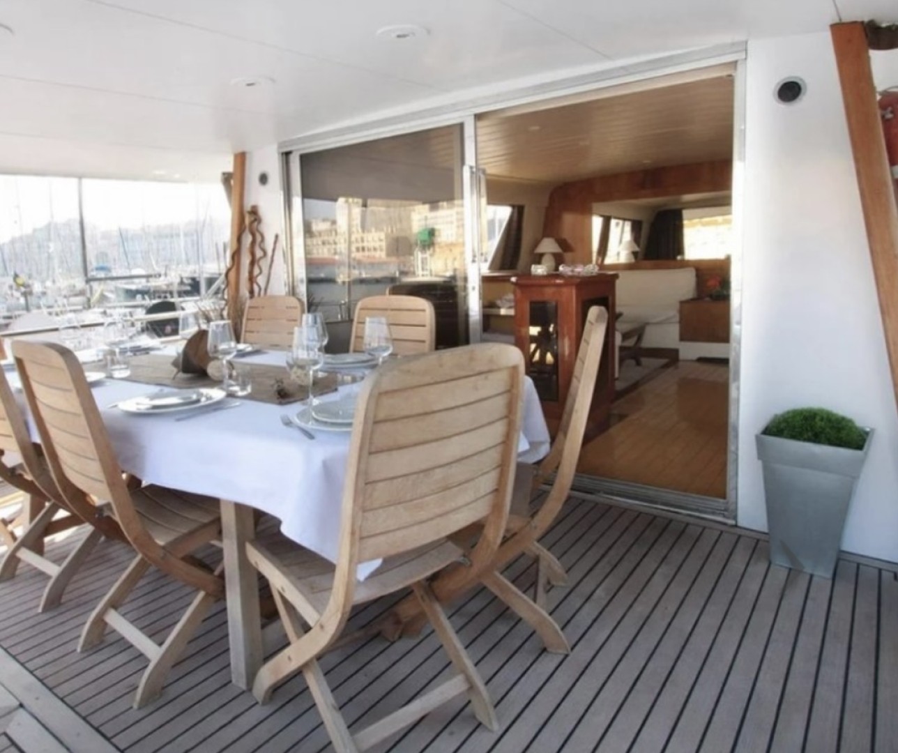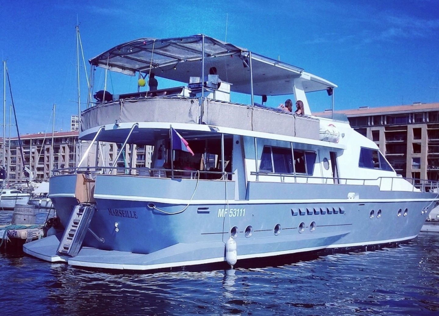 Ti offriamo un Versilcraft chic e confortevole con Flybridge (Rooftop), lungo 22 metri, con una superficie utile di circa 120M2 Il CYOS è disponibile solo per il noleggio in banchina durante il giorno o in serate per “cene aziendali, battesimi, compleanni, seminari, team building, serate, matrimoni, ecc.”, capienza massima in banchina ==> 45 persone. SI TROVA NEL VECCHIO PORTO DI MARSIGLIA PROPRIO DI FRONTE A NOTRE DAME!!!!!posizione eccezionale!!!!!!
